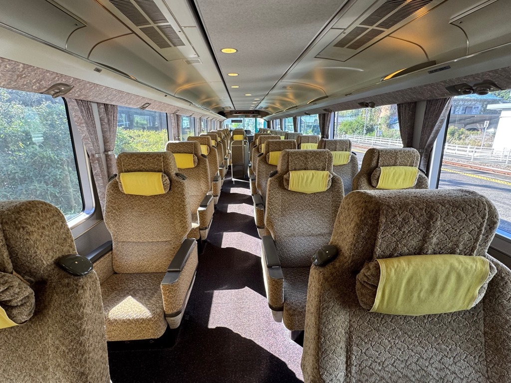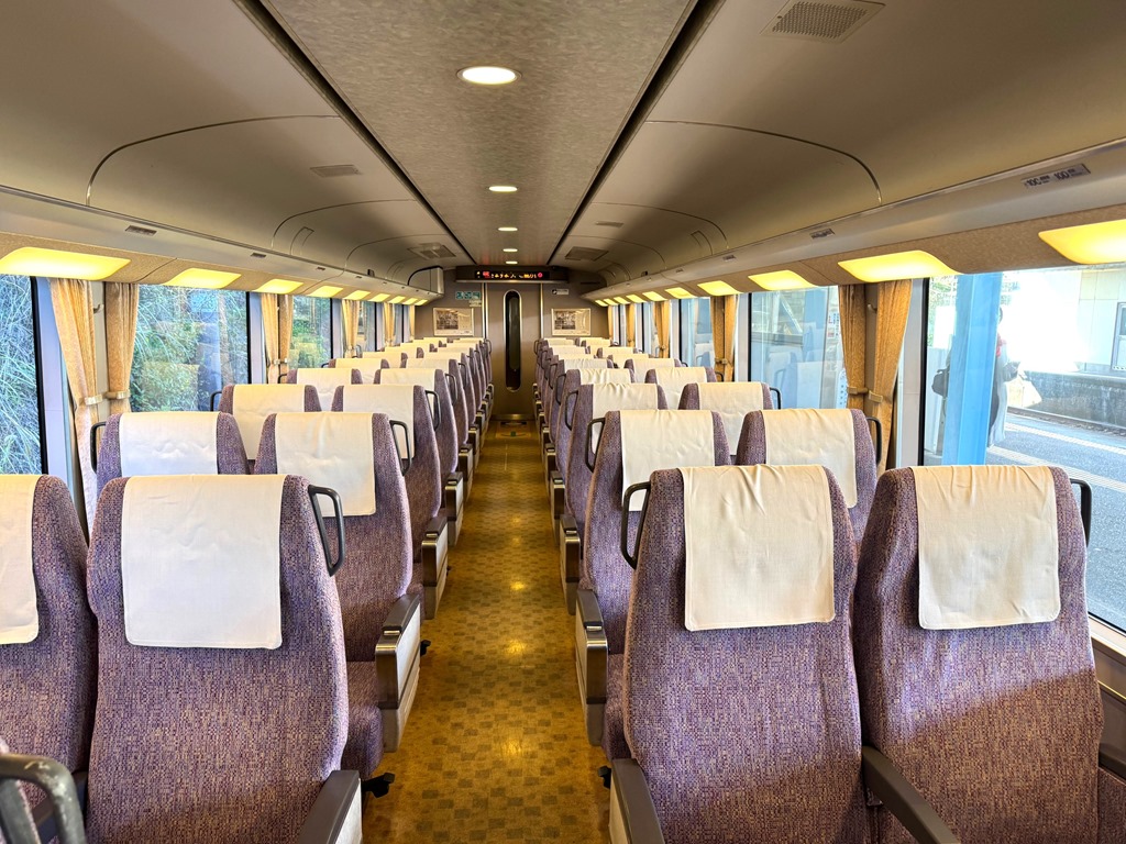 普通車は4列シート。発車時刻が迫っても乗客の姿なし。