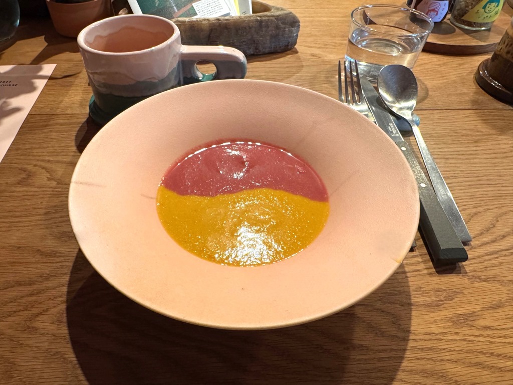 最初の「丘スープ」は、黄色がたまご茸・パプリカ・生姜、