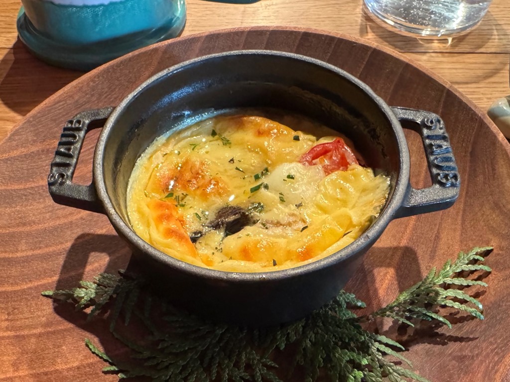 ポルチーニのアランチーニ、落葉と落葉乳酸発酵スープ、タカラチーズのふわふわ。
