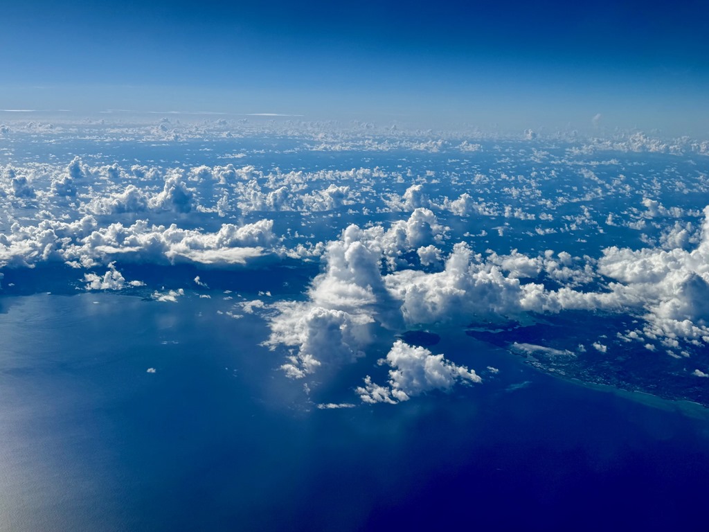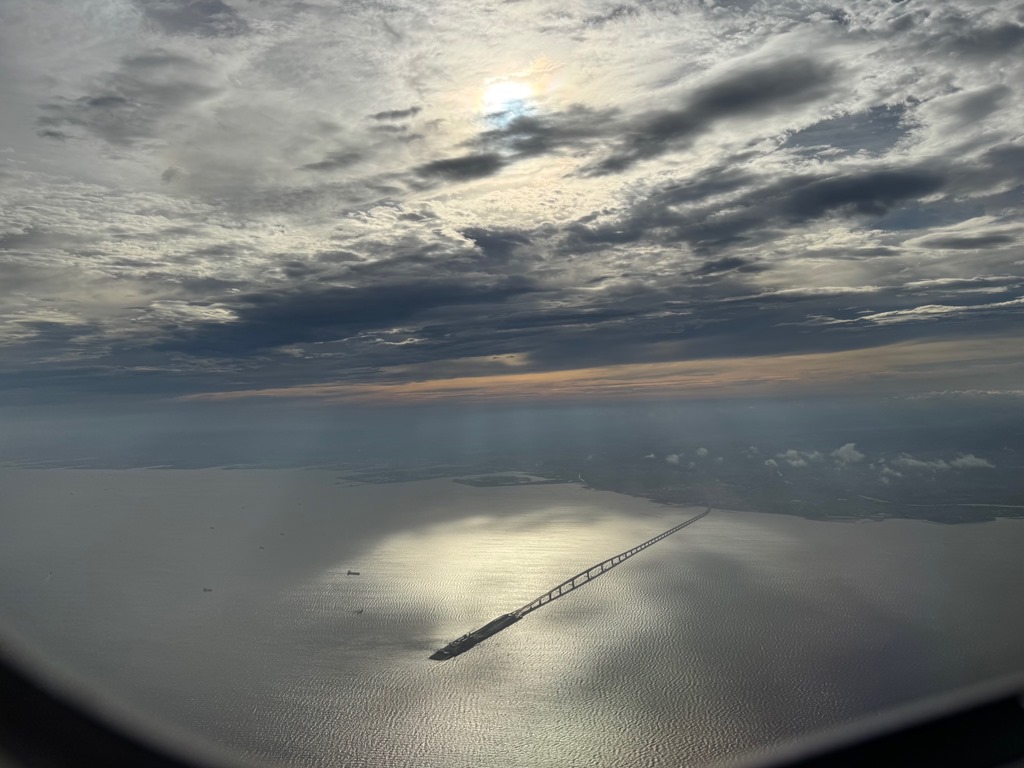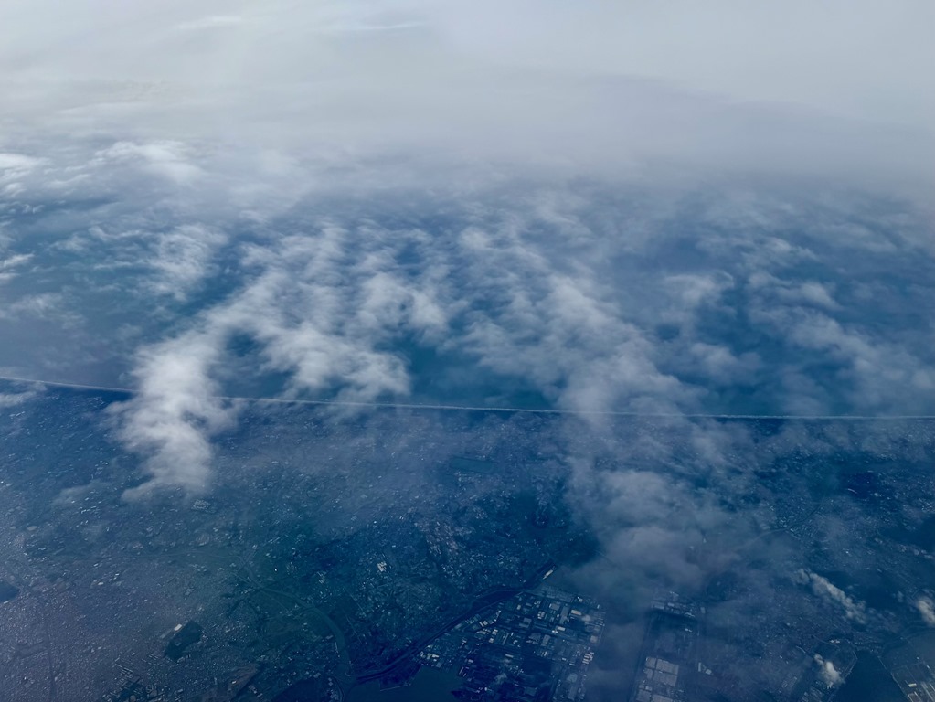 定刻に出発。離陸後旋回すると下方に東京湾アクアラインの「海ほたる」が見えました。雲が多いので多少の揺れは致し方ないところ。