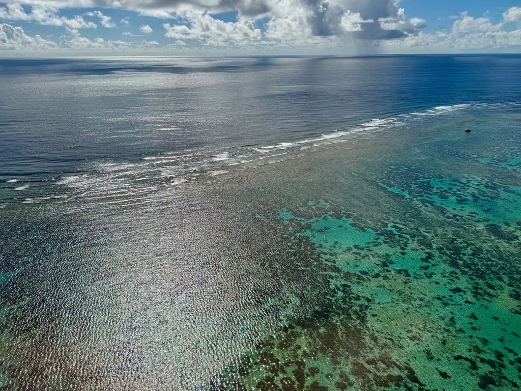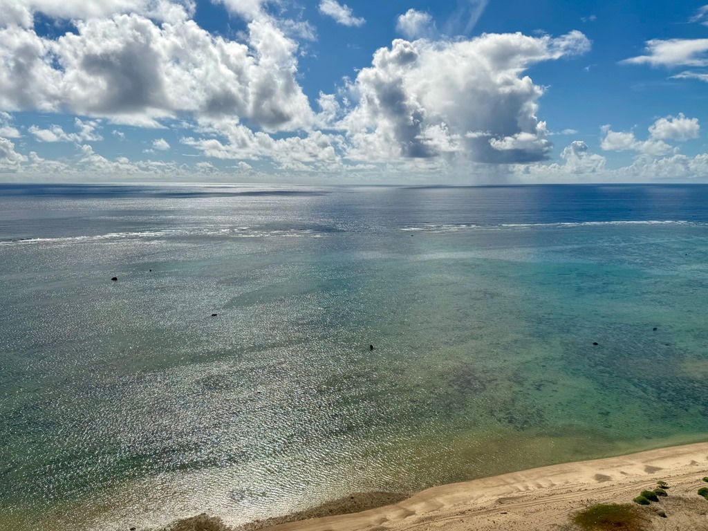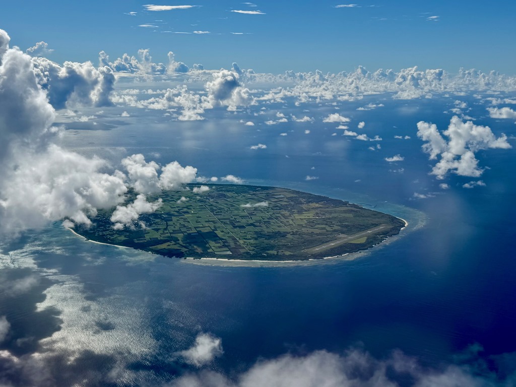 沖縄本島を過ぎて次第に高度を下げてくると、宮古島と石垣島の中ほどにある多良間島の姿が。