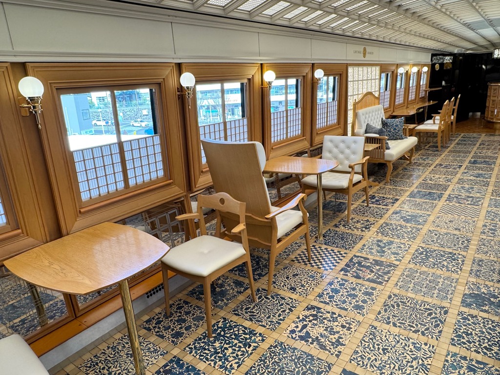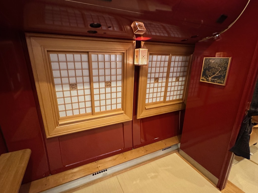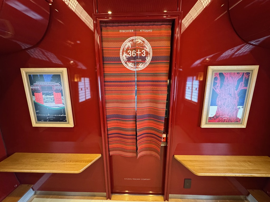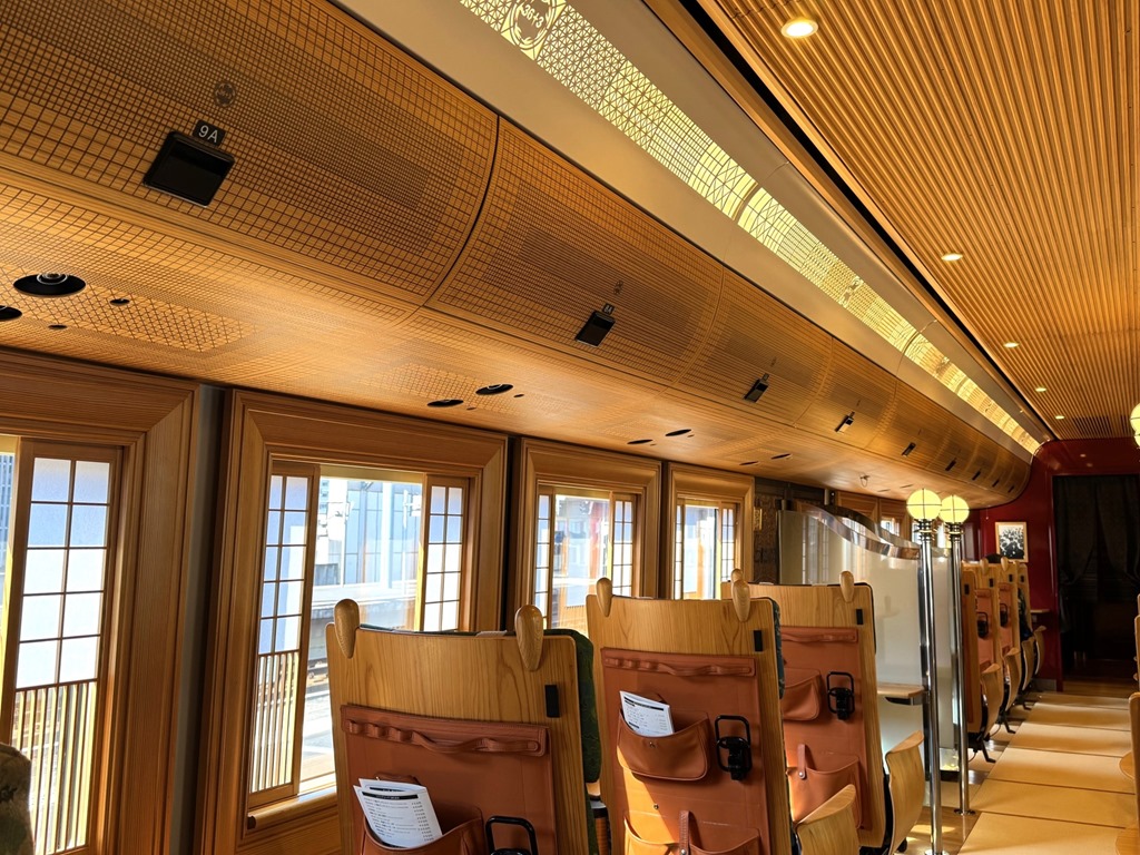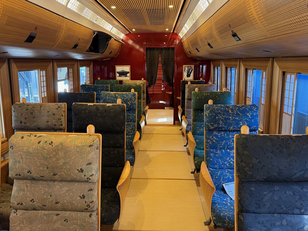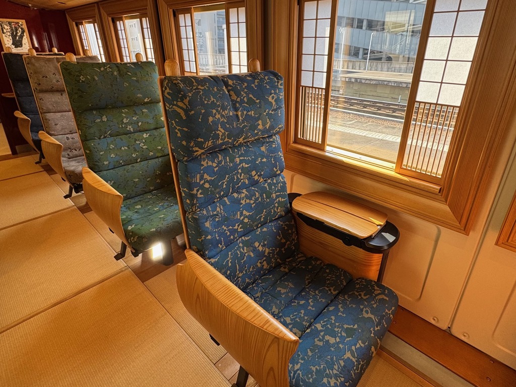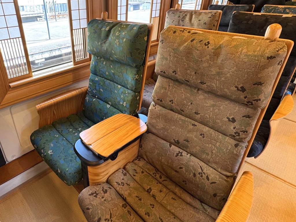 編成の両端1号車と6号車は畳敷きになっていて土足禁止なのでした。熊本県八代産のイ草をを使っているそうです。