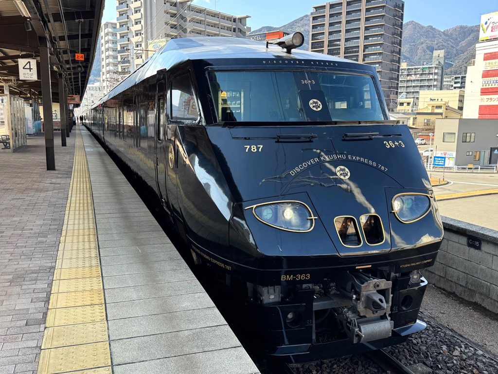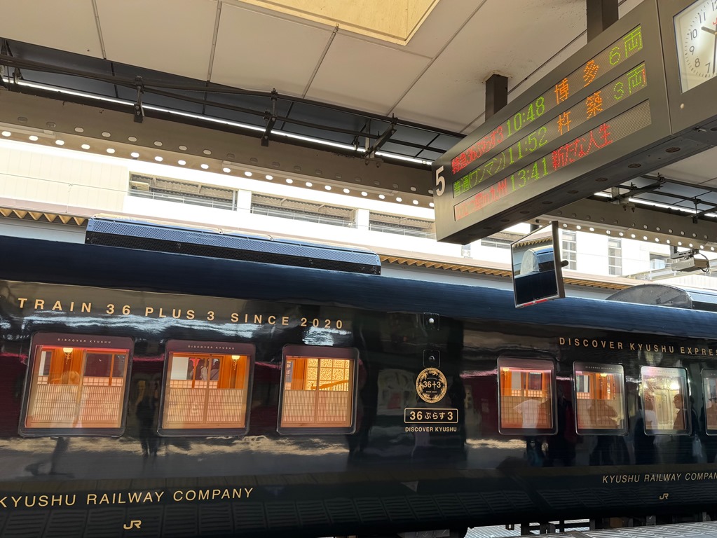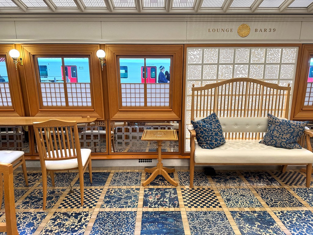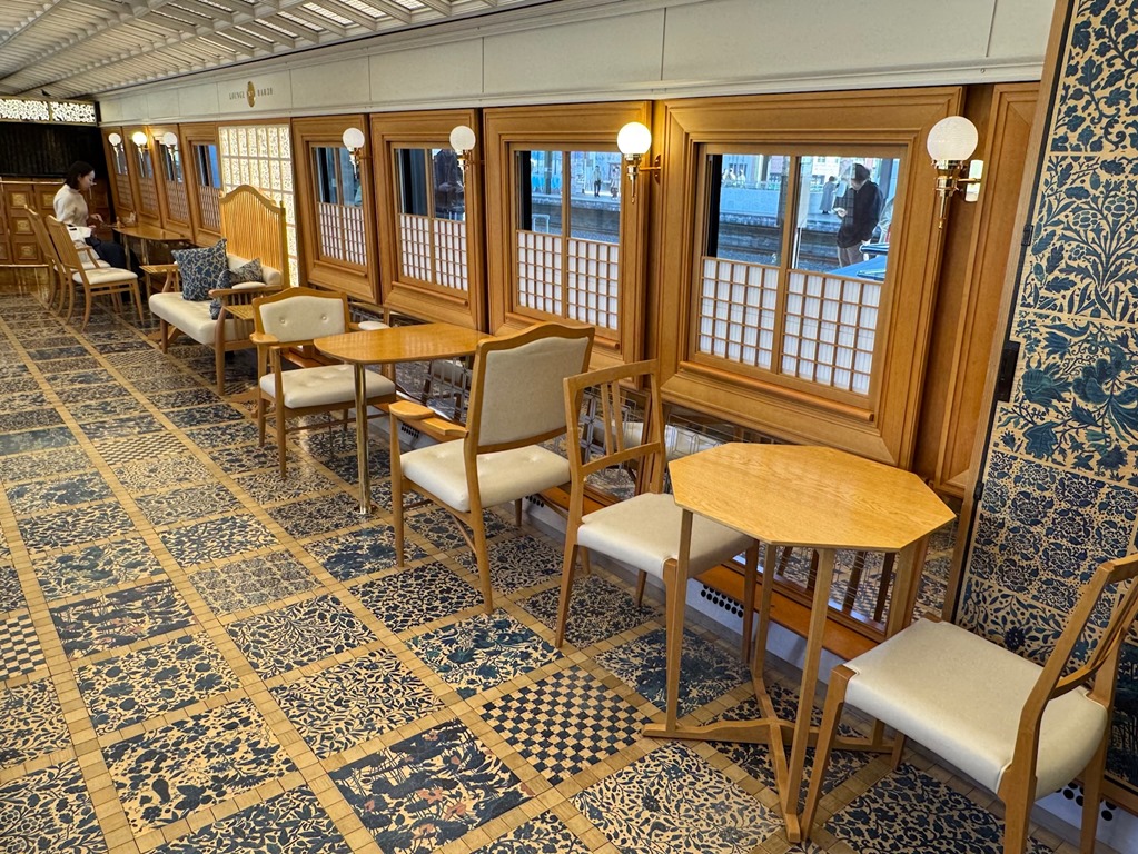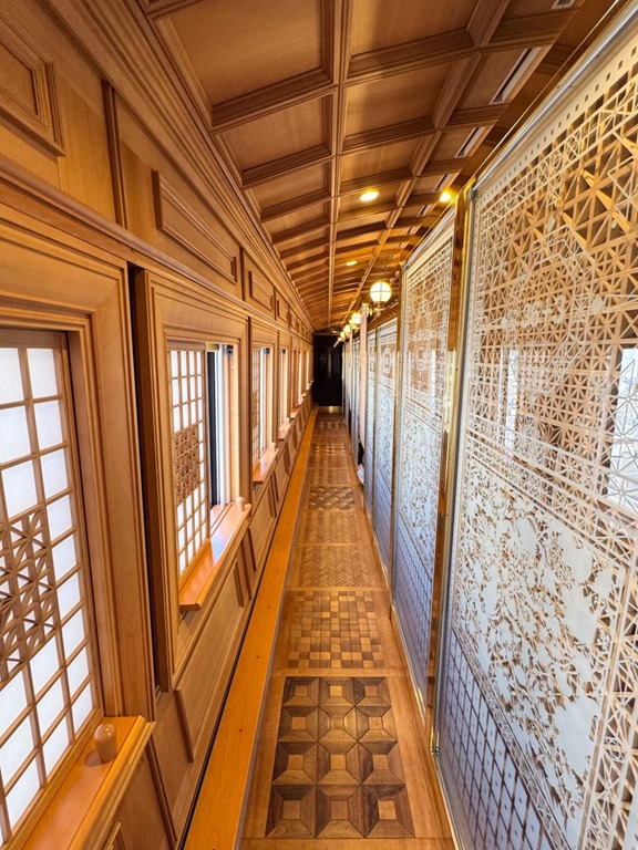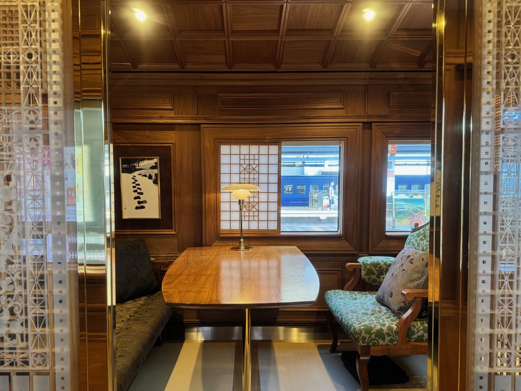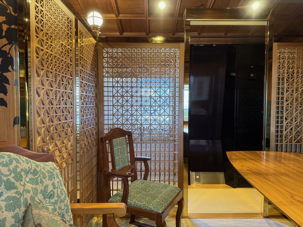 編成の両端1号車と6号車は畳敷きになっていて土足禁止なのでした。熊本県八代産のイ草をを使っているそうです。