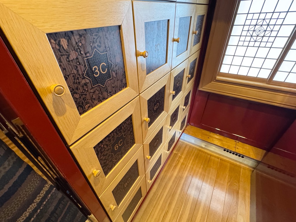 編成は6両。われわれの座席は最後部6号車の最後列でしたので、意気揚々と6号車に乗り込むと、まず入口にシューズボックスが。